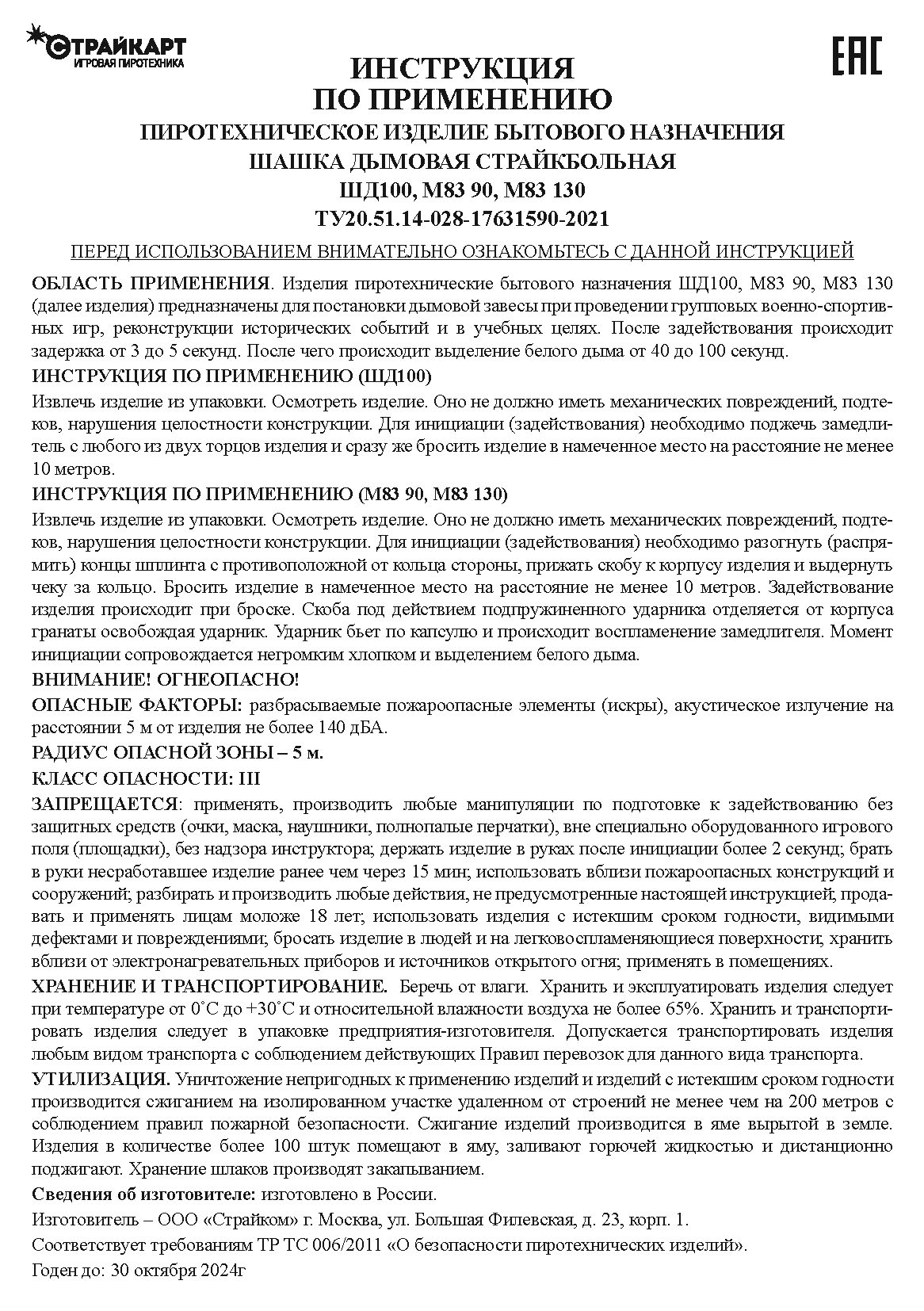 - 90 грамм дымового состава выделяется в течение 60-90 секунд;
